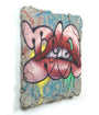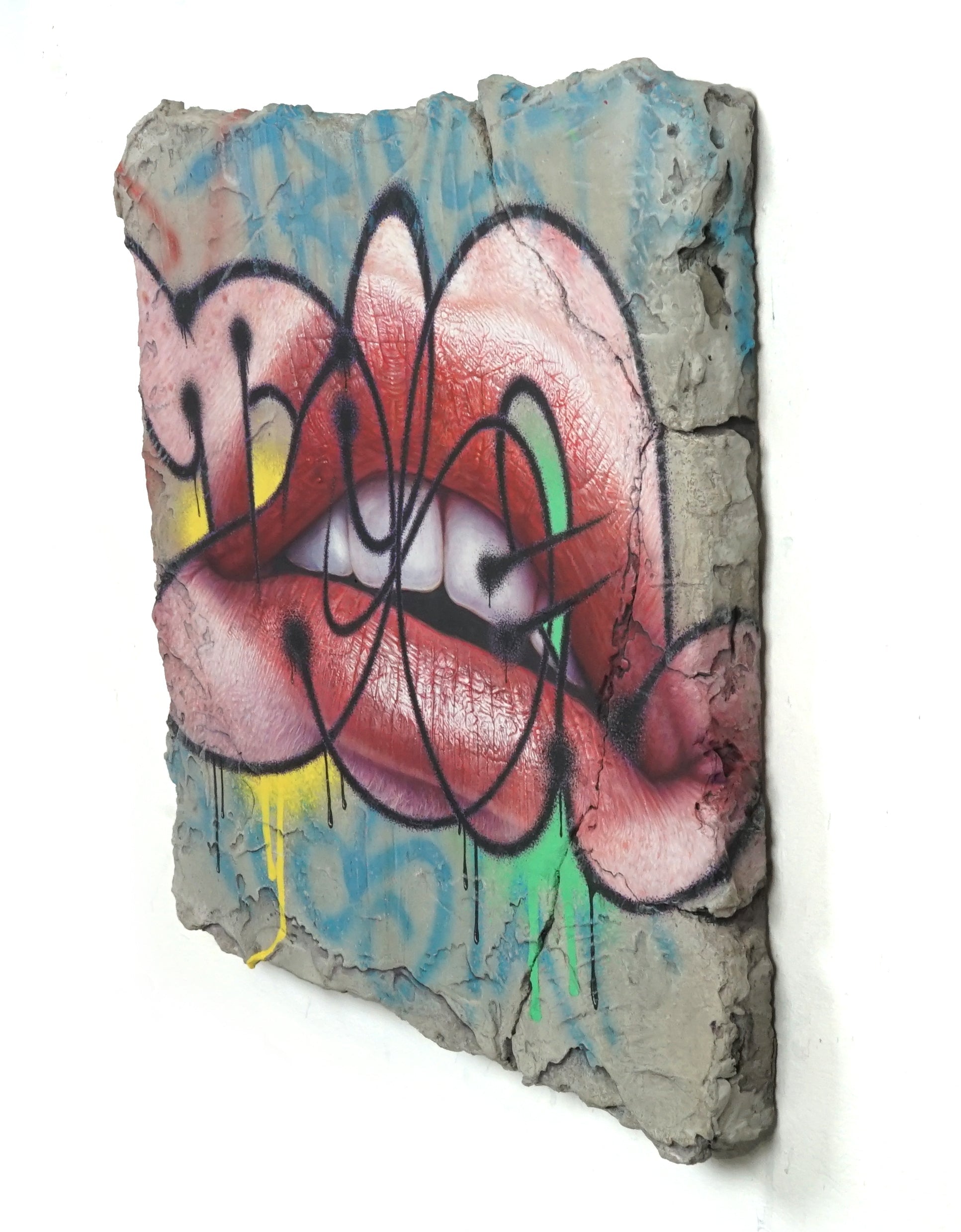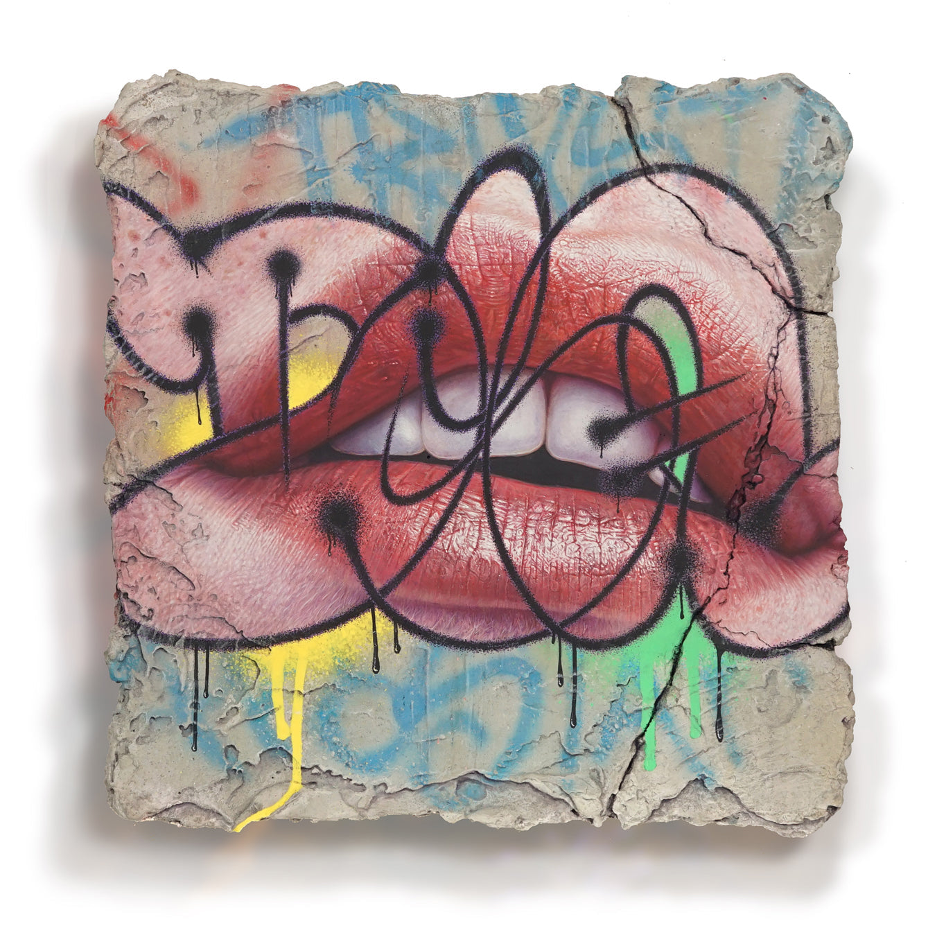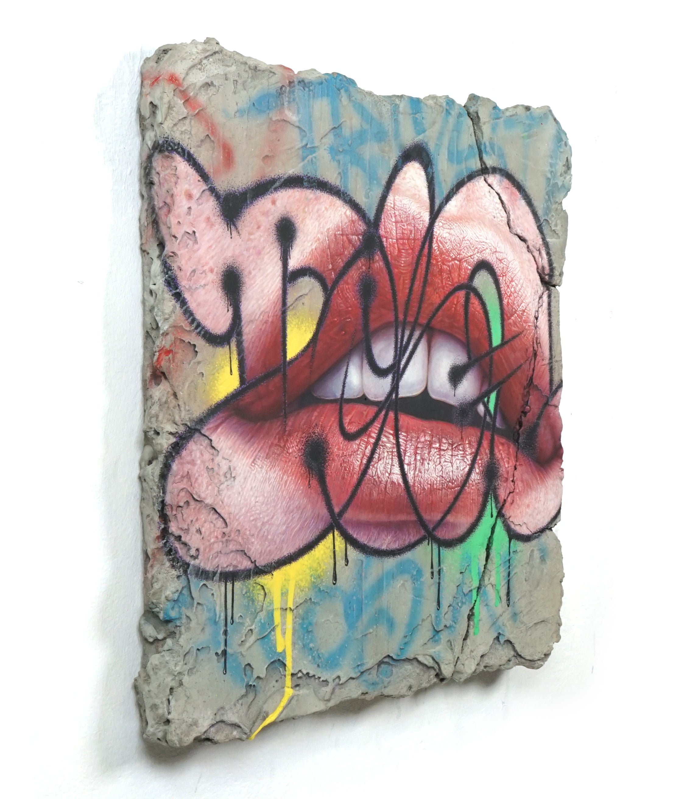 Acrylics, Spray paint, concrete and resin on wooden panel.