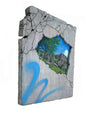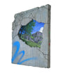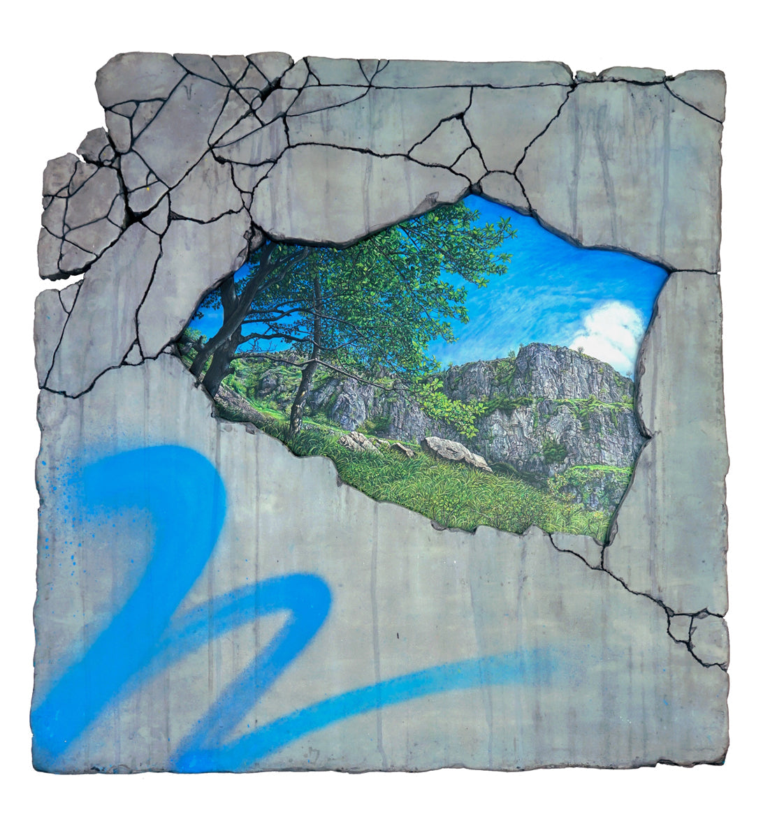 Acrylics, Spray paint, concrete and resin on wooden panel.