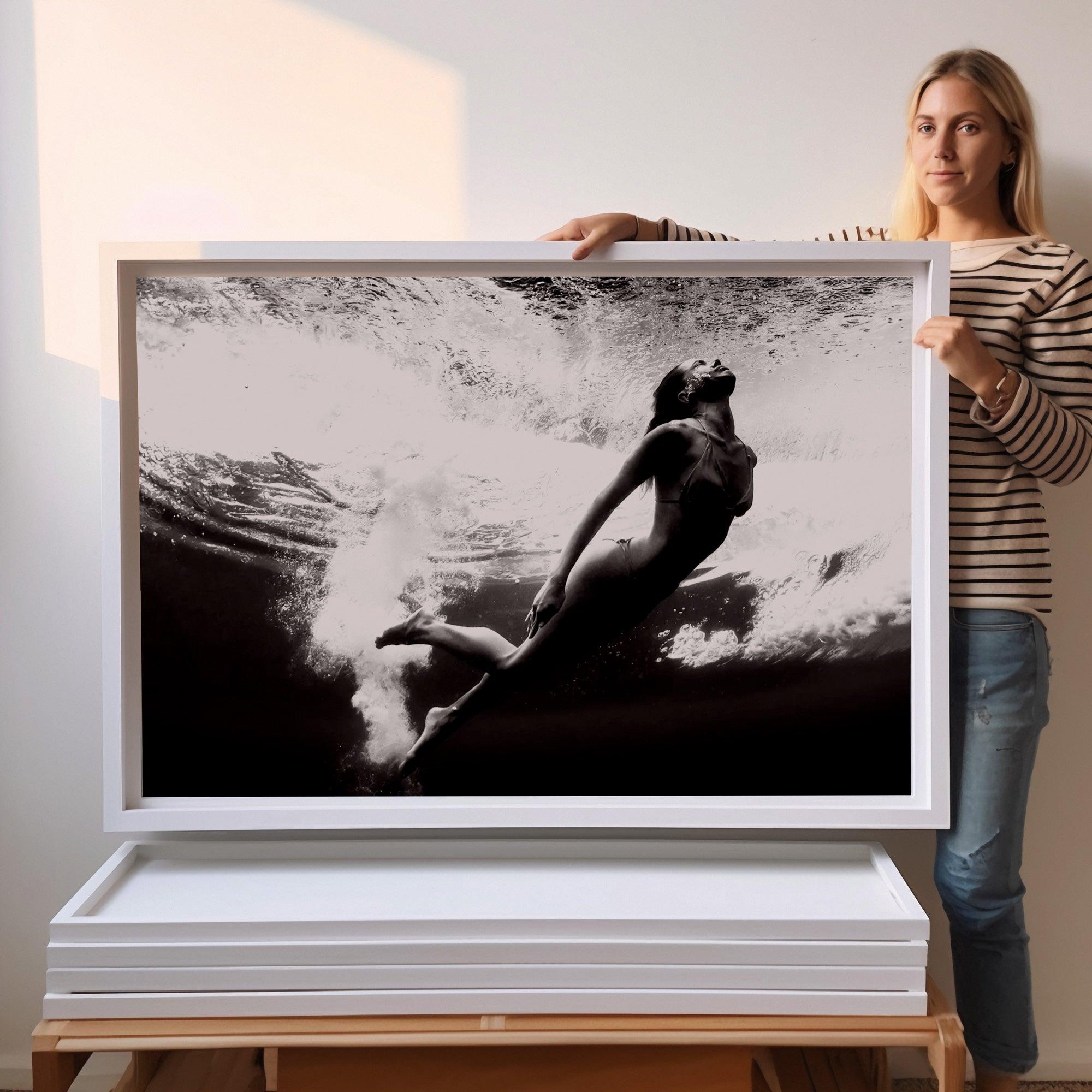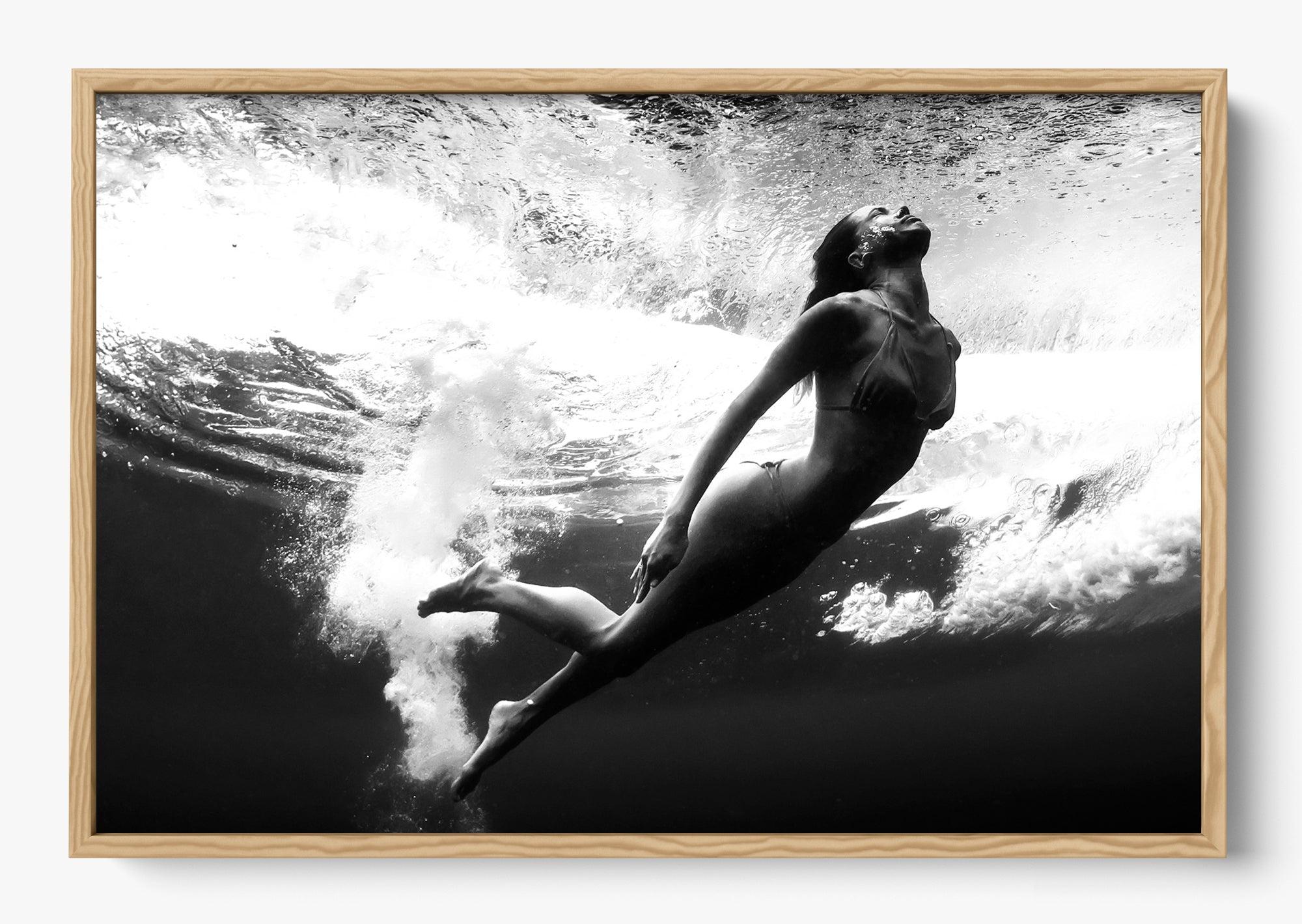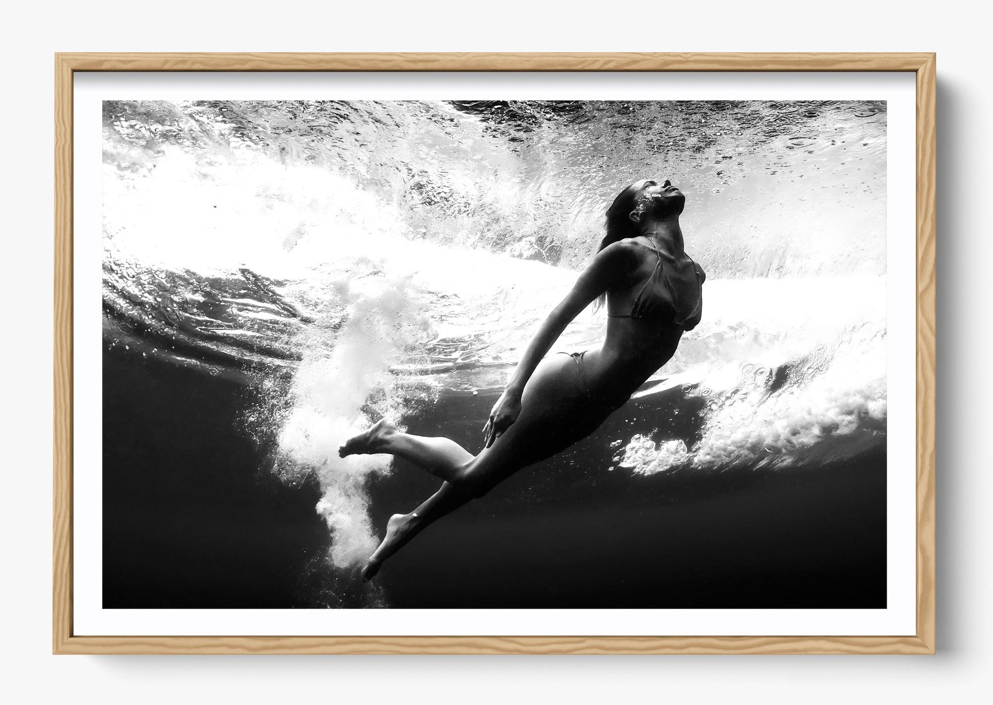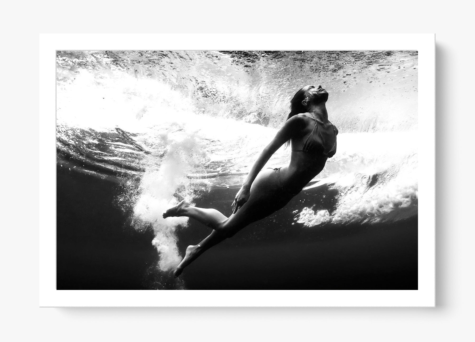 "Just Breathe" captures a suspended moment beneath the surface, where motion slows and form becomes fluid. Rendered in black and white, the composition emphasizes contrast, balance, and quiet strength - creating a calm, contemplative presence in any space.