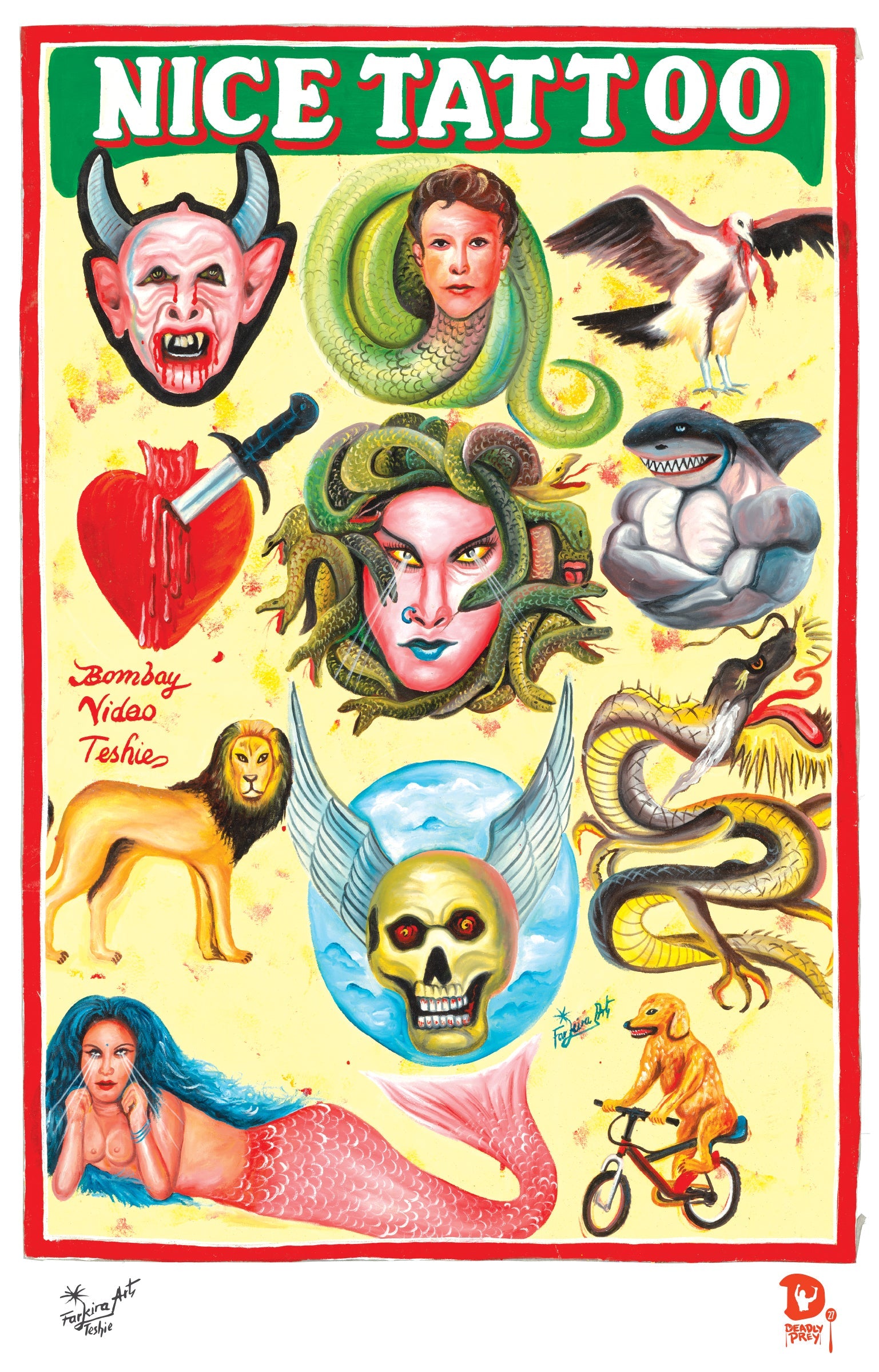 For many years tattooers and tattoo collectors have been fascinated by these incredible Ghanaian movie paintings that we all love. But did you know that the artists in Ghana are equally fascinated and influenced by tattoo art?!? 5+ years ago we asked a few of the artists we work with in Ghana if they’d be interested in painting tattoo imagery in the same style as their hand-painted movie posters. Needless to say, the results over the years have been astonishing!! It’s actually already become its own genre within the hand-painted Ghanaian movie poster genre.