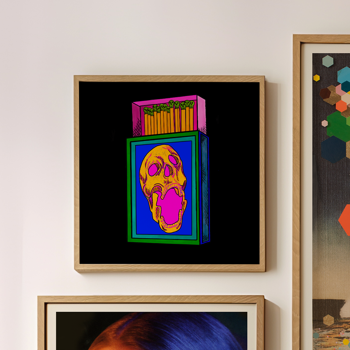 This psychedelic matchbox print blends retro horror with vibrant neon color. A pop art tribute to the strange and boldly surreal.