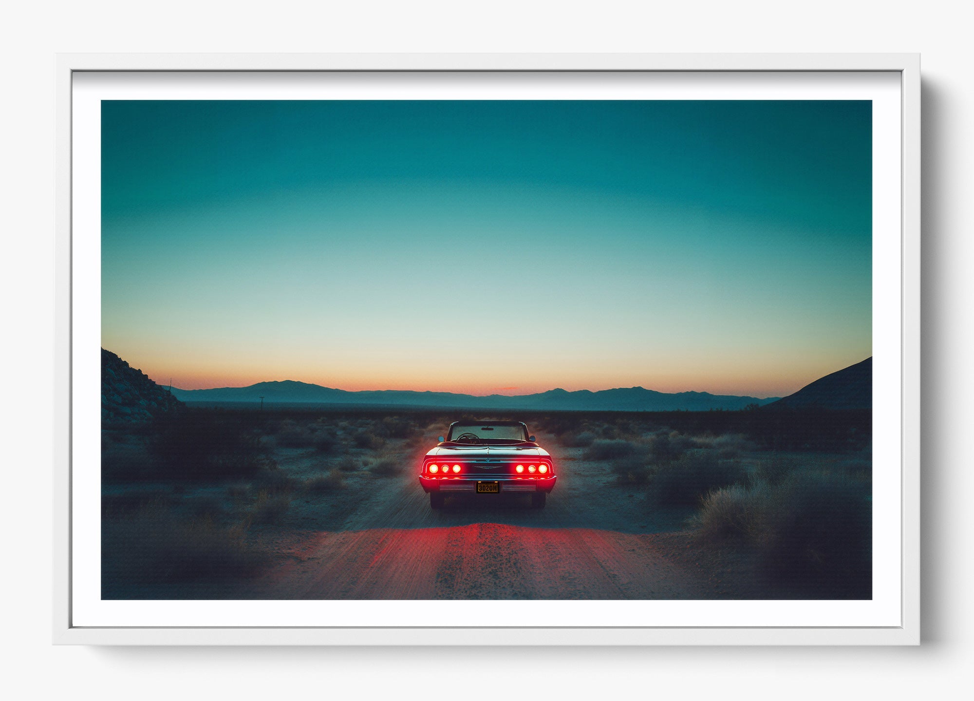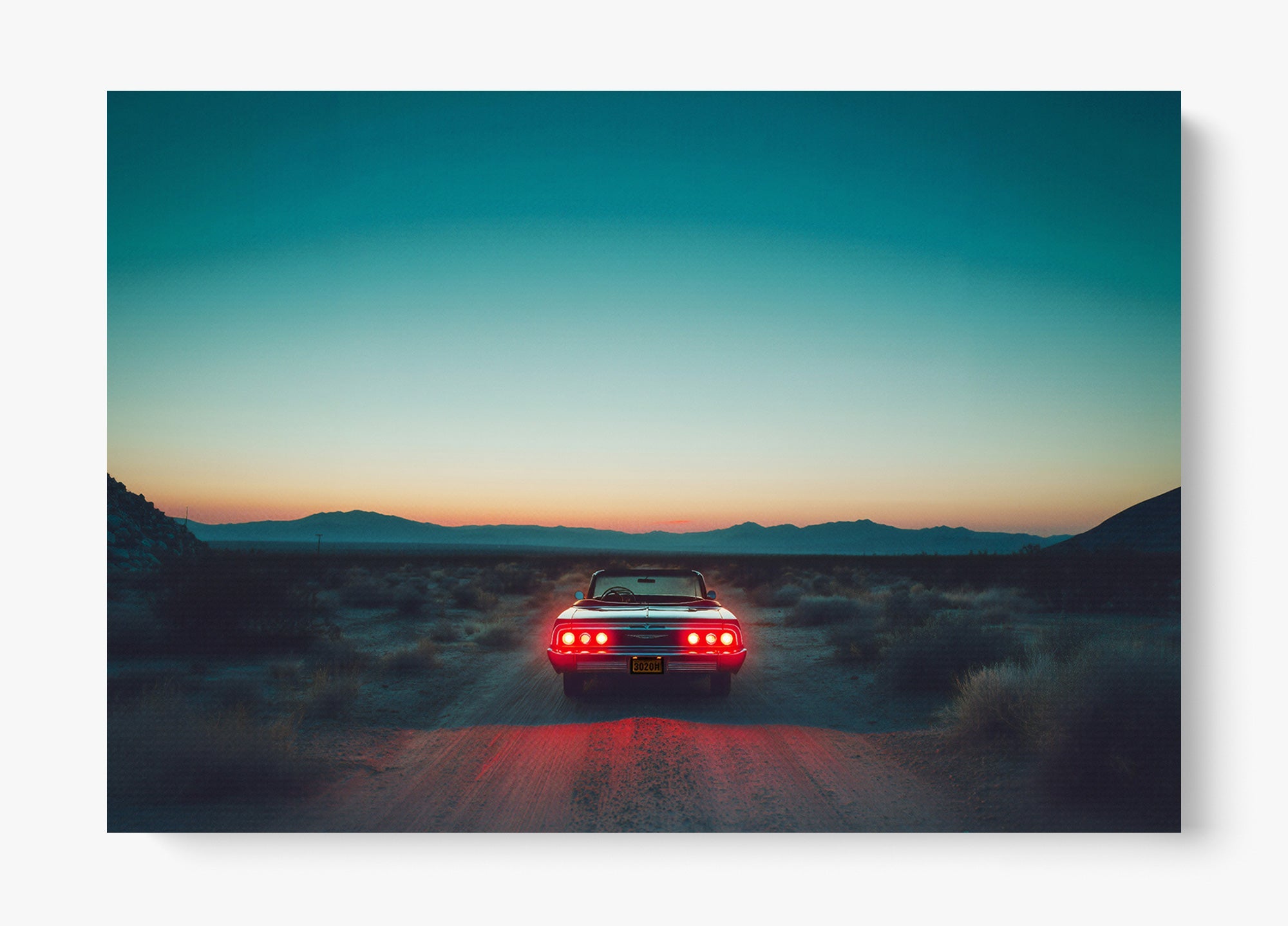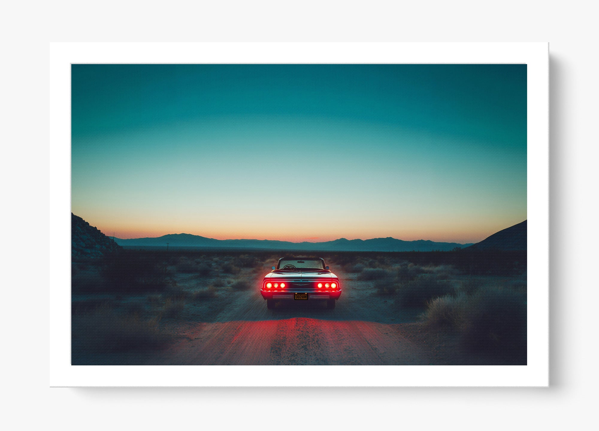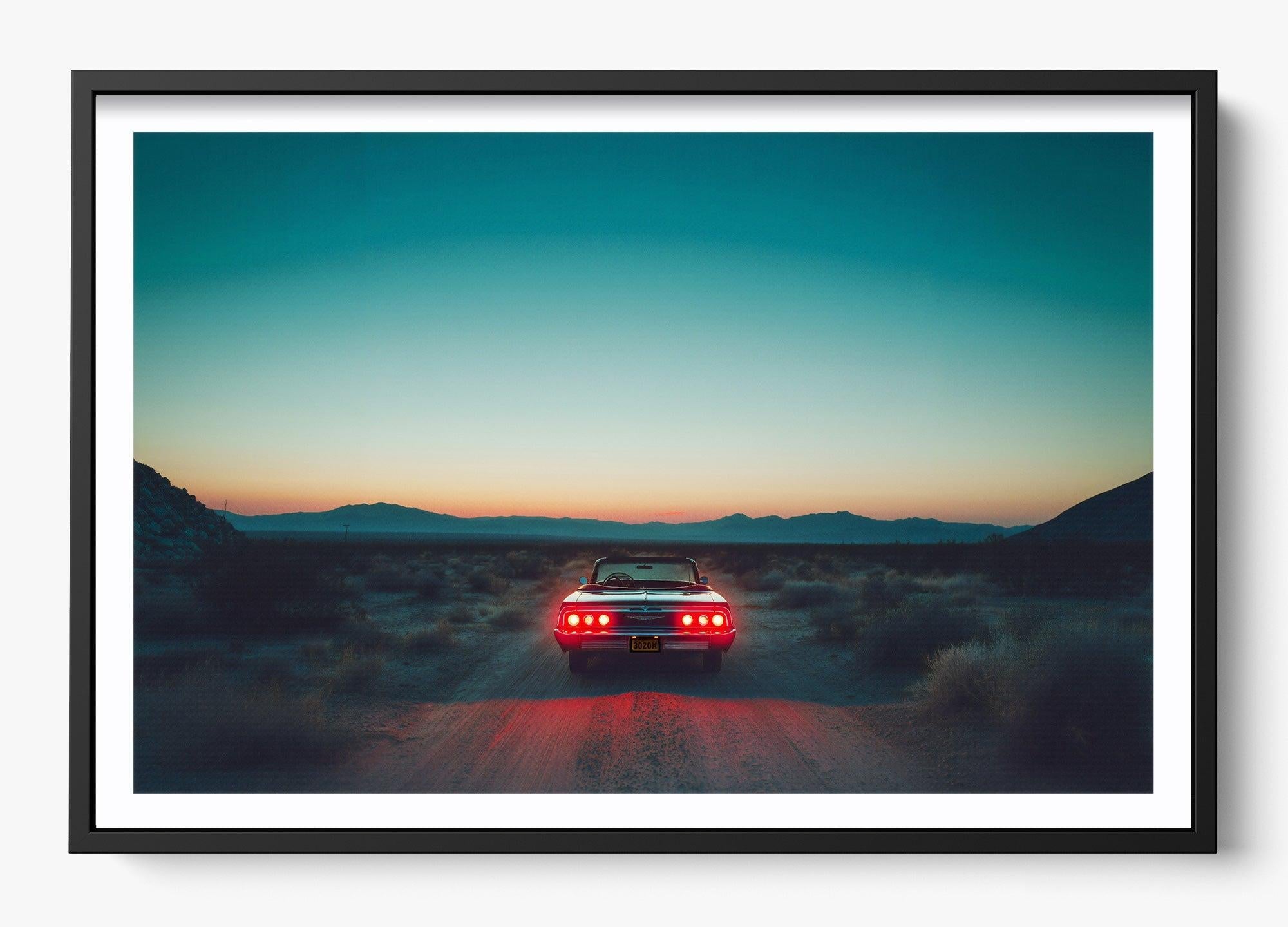 A pause in time, held in gold. Stop Right There captures a classic Mustang resting in the vast Mojave Desert as the sun sinks low, casting warm cinematic hues across steel, sand, and sky. It’s a portrait of stillness with an undercurrent of motion—a legend built for speed caught in a rare, quiet moment.
