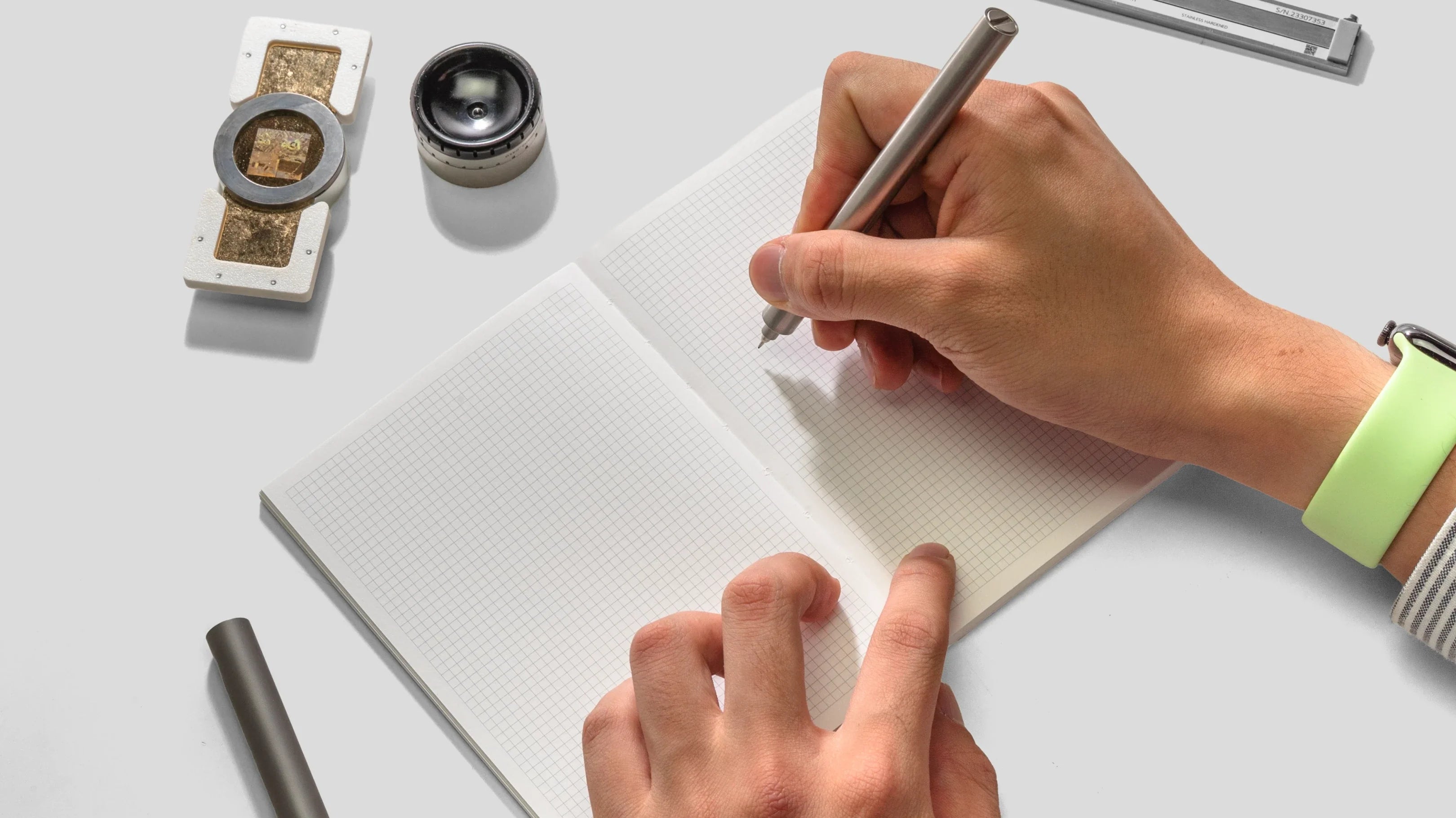The white + grid versions are made using FSC certified acid free-archival paper. The white version has blank pages. Featured here with Pen Type-B.